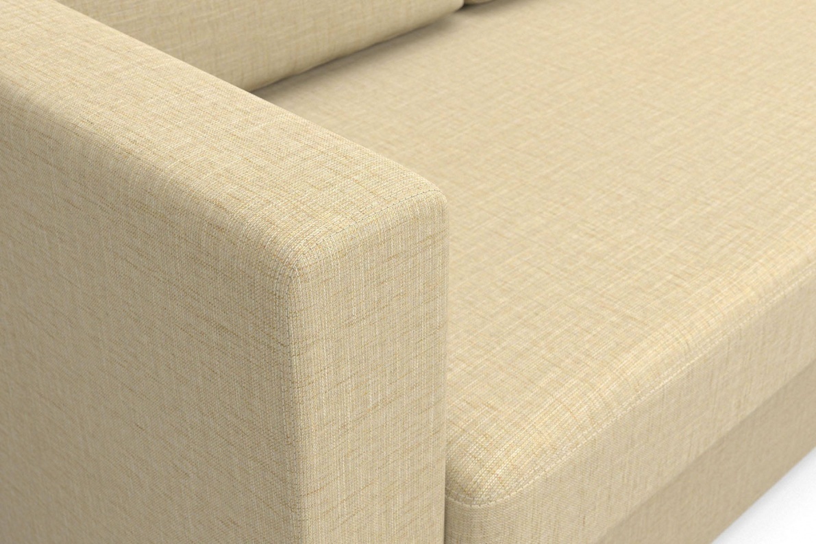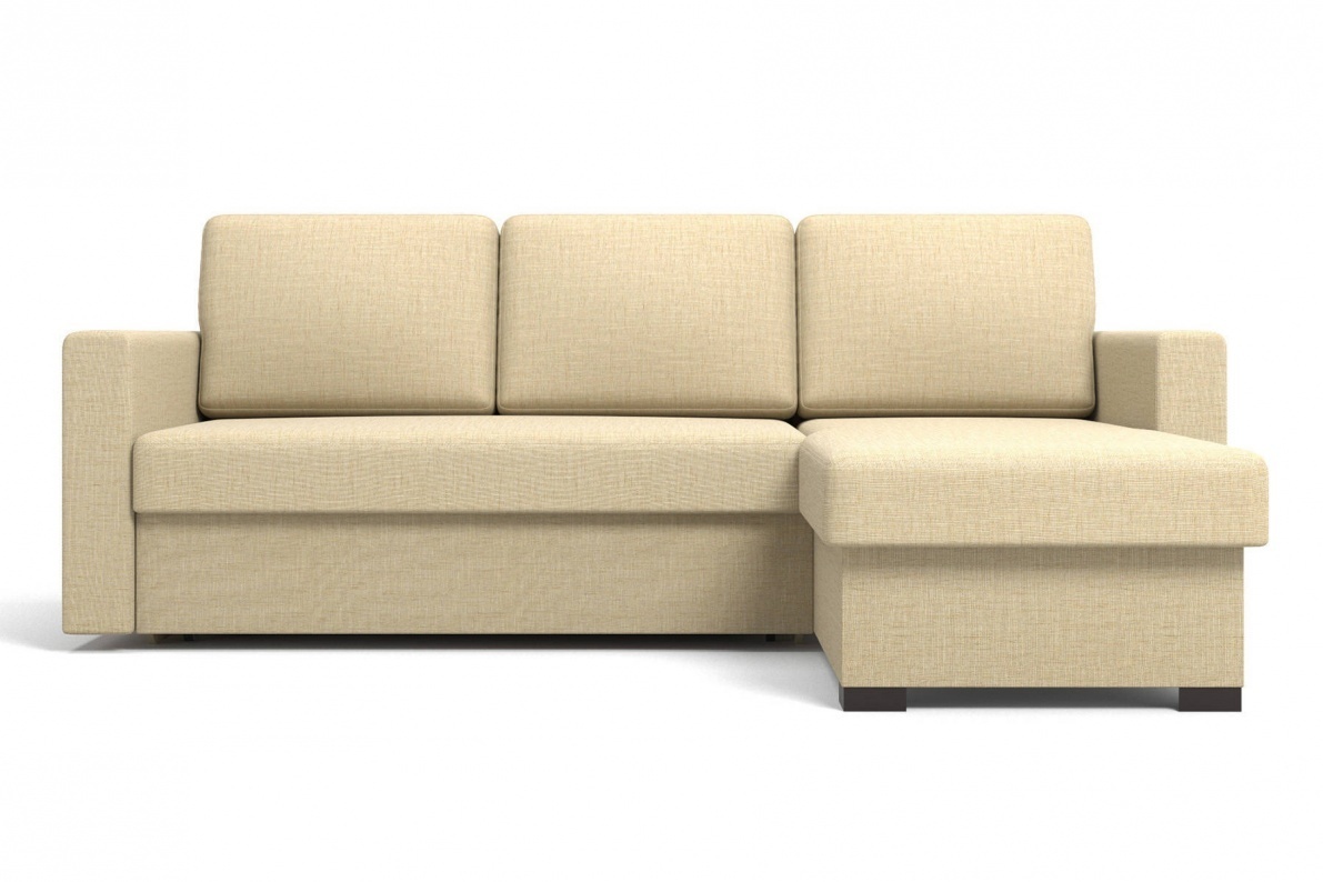 Просторный диван с выступающим сегментом в кремовой обивке из рогожки. Прямоугольные подлоктоники и три широкие подушки на спинку. Наполнитель из пенополиуретана и пружинной змейки позволяет поддерживать необходимый баланс между жесткостью и мягкостью дивана.