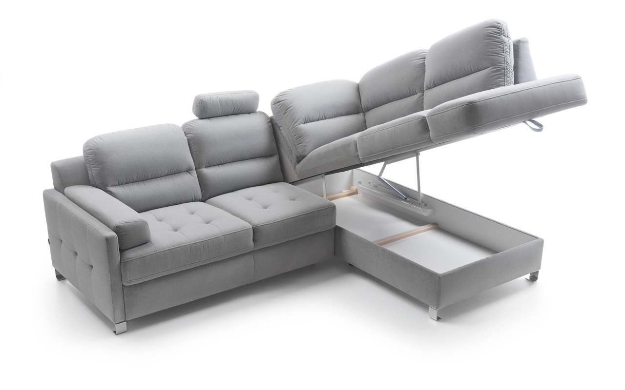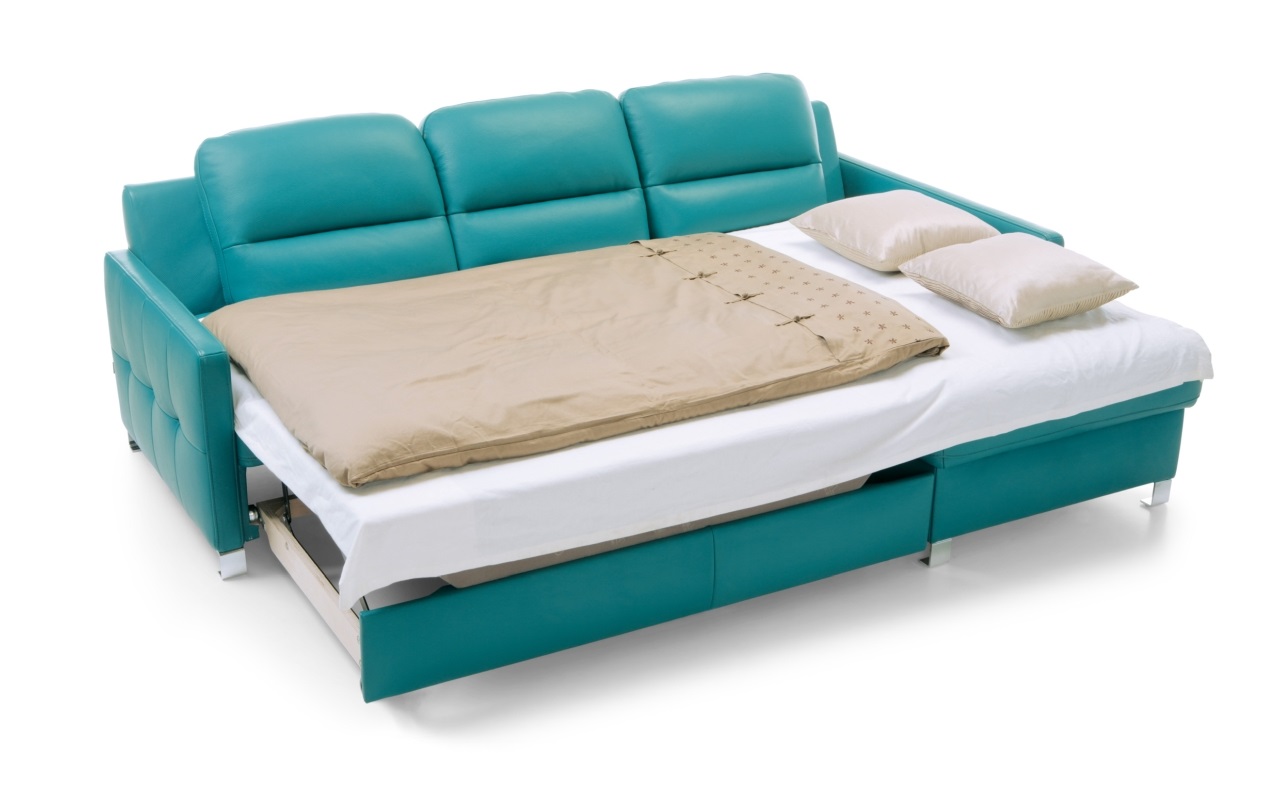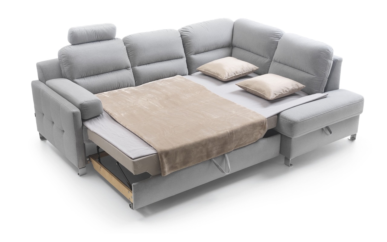 код 131024Диван оснащен механизмом трансформации и удобным ящиком для постельных принадлежностей. Можно дополнить подголовниками.