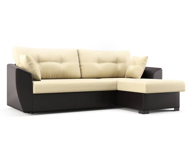 Угловой диван в оригинальном стиле с бежево-черной расцветке комбинированной обивки из экокожи и рогожки. Прямоугольные полокотники плавно расширяются кверху и имеют удобный наклон в сторону ложа. Две широкие подушки с лекгой простежкой по центру позволят быстро расслабить тело, особенно, если расположить ноги на выступающем сегменте.