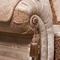 Просторный угловой диван в роскошном дизайне, вдохновленном стилем ампир. Закругленные гнутые подлокотники и слегка откинутая спинка ракушкой с диагональным углом. Диван богато украшен декорированными ободками и глянцевым узором на подушках и спинке. Обивка в кремовых тонах.