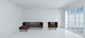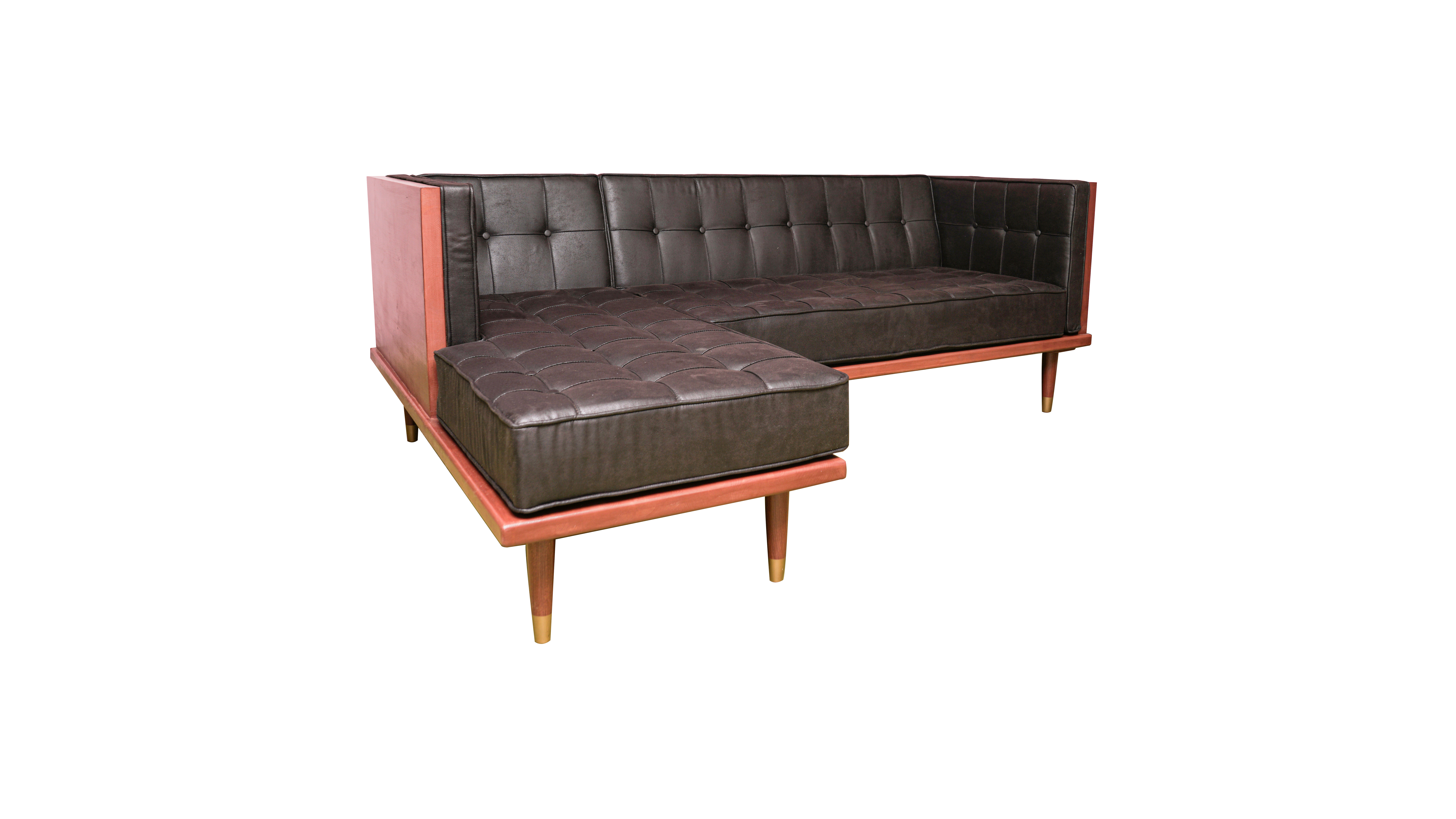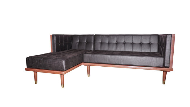 Классический угловой диван для гостиной в светлой кожаной обивке.