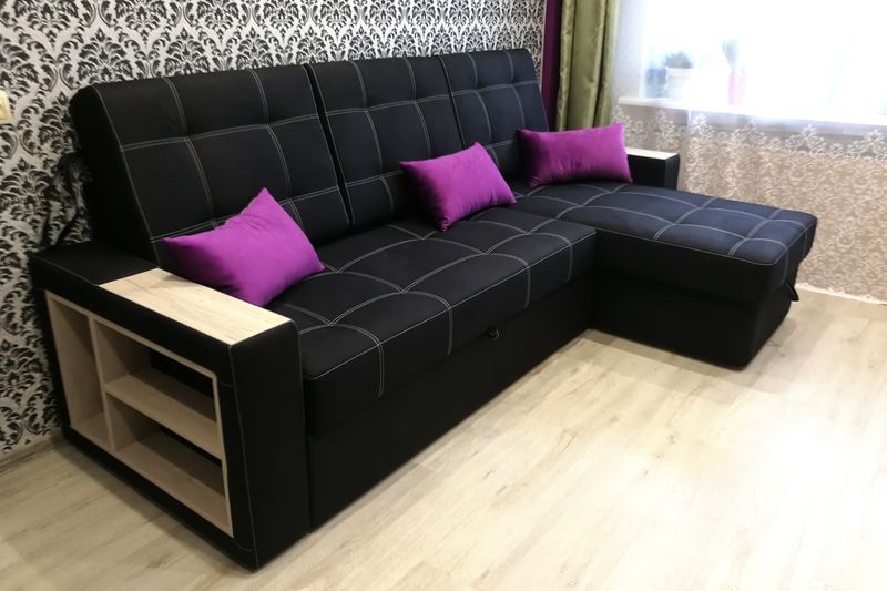 Эргономичный угловой диван для размещения в гостиной. По всей поверхности дивана идет стяжка серой строчкой. В обоих подлокотниках расположены небольшие полки для различных мелочей. В диване присутствует вместительный ящик для белья.