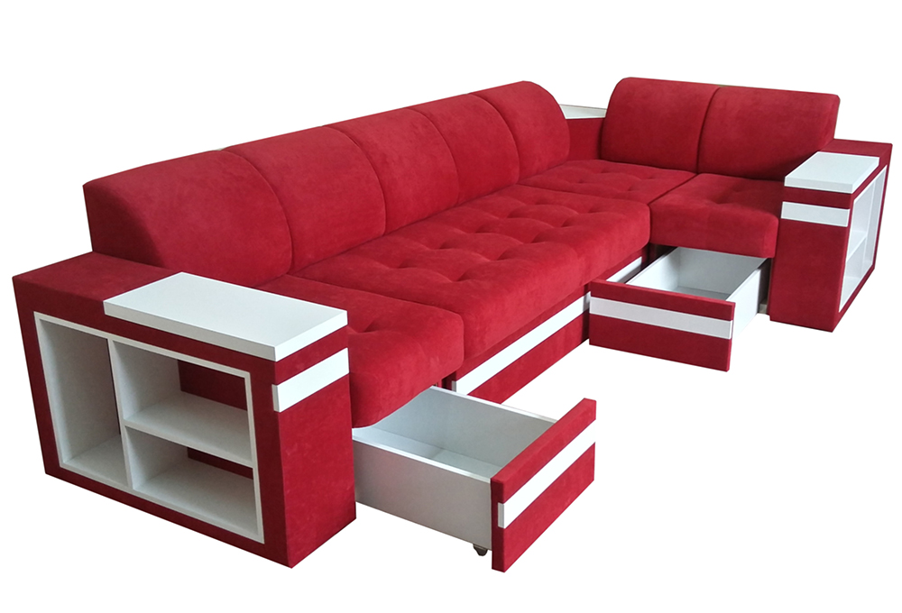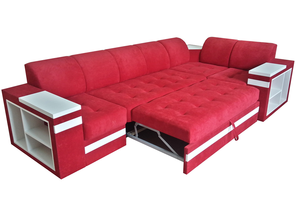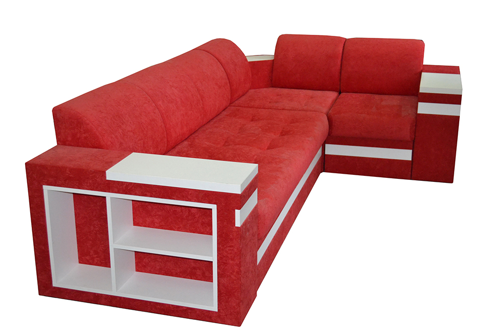 Угловой диван «Престиж» красный. Яркий красный диван со вставками белого цвета — отличное решение для обустройства вашего дома. Просторный диван с помощью современного механизма трансформации за считанные секунды превратится в удобную кровать с нишей для хранения постельных принадлежностей.