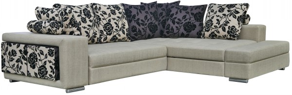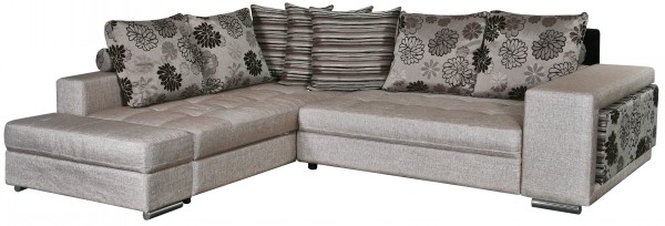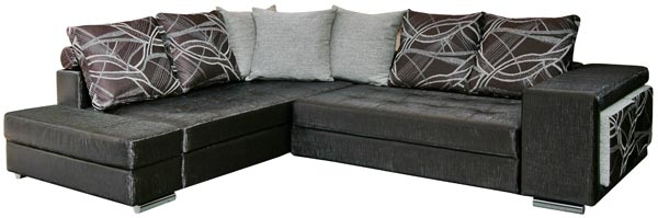 В качестве опоры служат трубчатые металлические ножки, а в качестве обивки применяется качественная ткань. В комплекте также имеются мягкие декоративные подушки. Боковины дивана съемные.