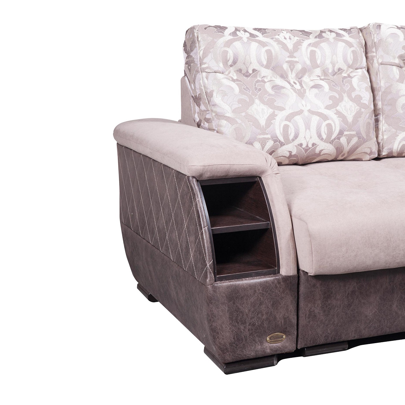 Угловой диван «Ричмонд» представлен в оригинальном дизайне со встроенными в подлокотниками глубокими полками. В цветовом оформлении использованы темный и светлый цвета, которые придают диваны свою индивидуальность. Раскладка «тик-так» позволила добавить удобный бельевой ящик и создать дополнительное спальное место.