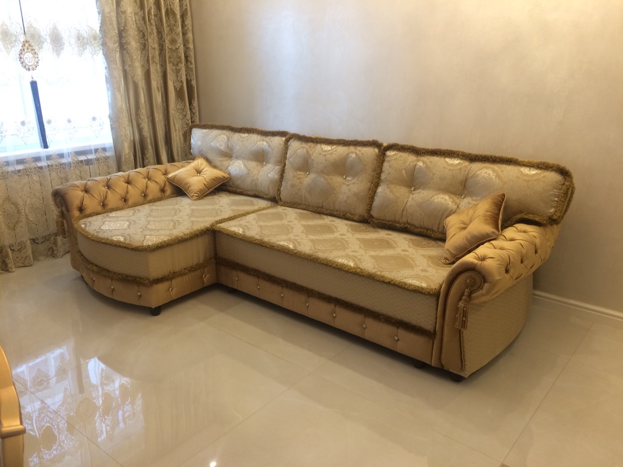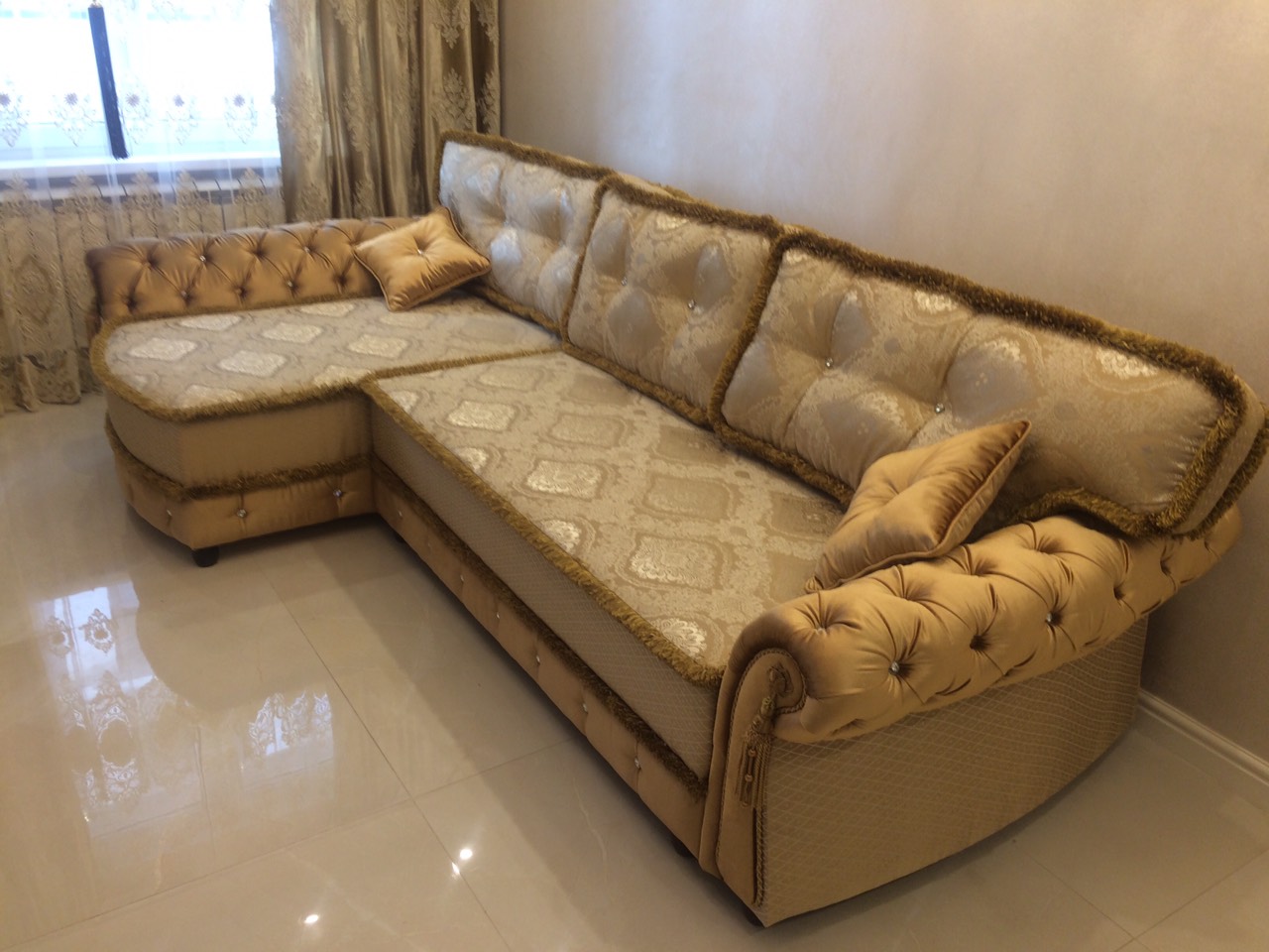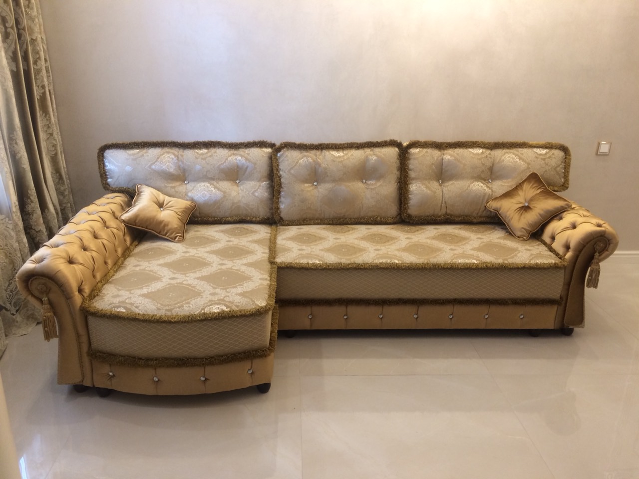 Изящный угловой диван станет украшением для гостинной комнаты. Модель декорирована богатой обивкой с отделкой бахромой, подлокотники имеют аккуратную пиковку. Сиденье мягкое и комфортное. Конструкция установлена на деревянных ножках.