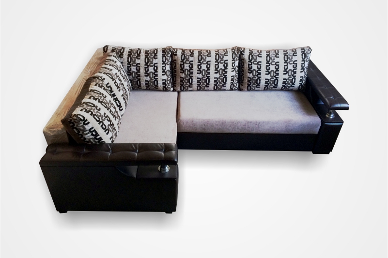 Угловой диван с подлокотниками привлекает своим дизайном. Модель выполнена в комбинированных цветах. Удобство и комфортный отдых придают мягкие подушки размещенные на спинке дивана. Конструкция оснащена просторными ящиками для хранения различных принадлежностей.
