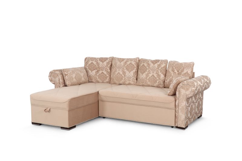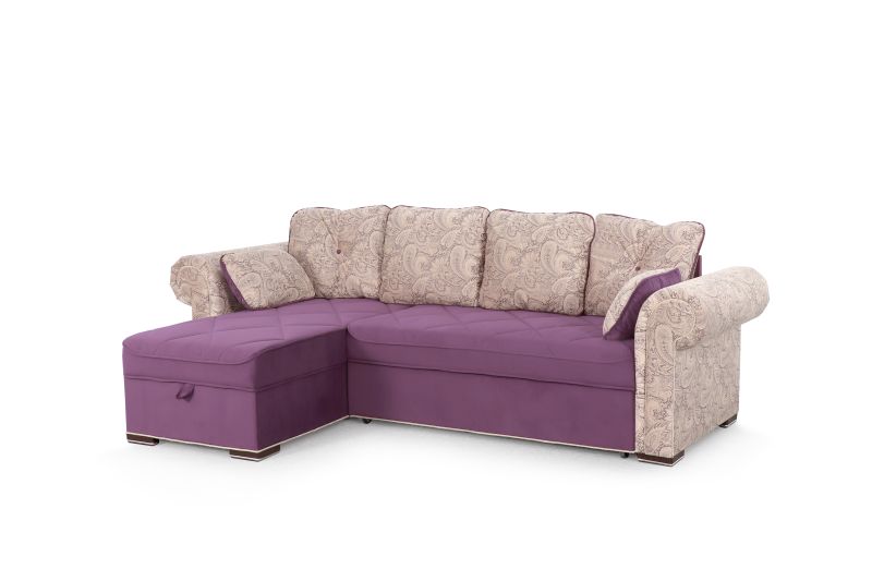 Угловой диван красного цвета. Оснащен ящиком для белья.