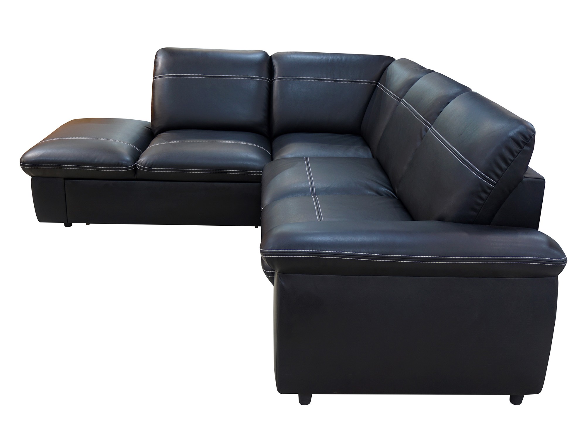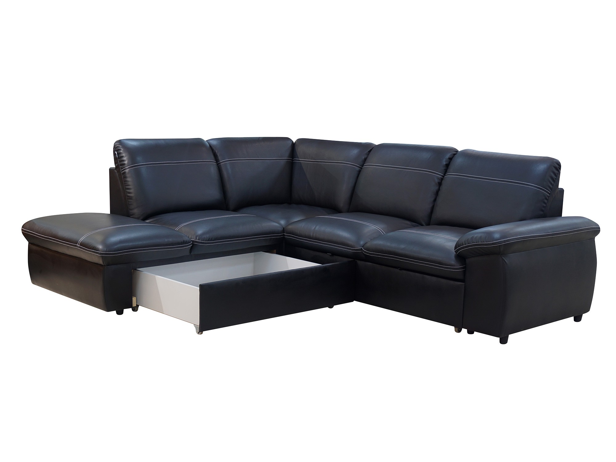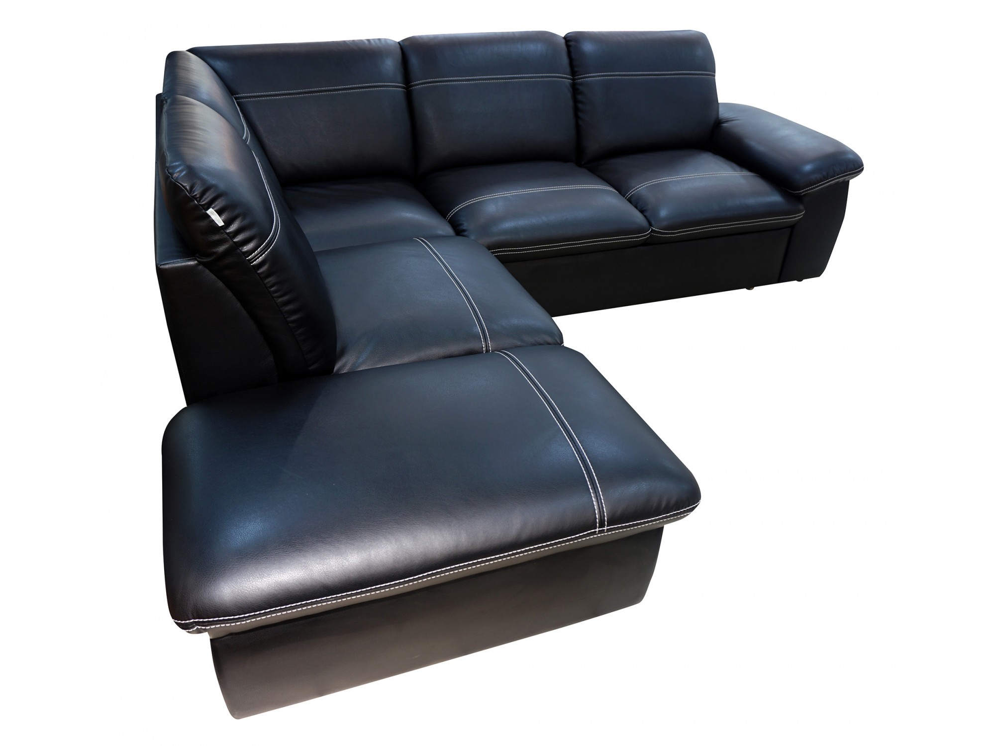 Комфортабельный черный кожаный угловой диван с выступающим сегментом для возможности расслабить ноги. Смягченный подлокотник, спинка с комфортным углом наклона и сиденье выложены удобными квадратными подушками с декоративной прострочкой. Механизм раскладки «дельфин» позволит быстро складывать и раскладывать модель, не тратя много времени.