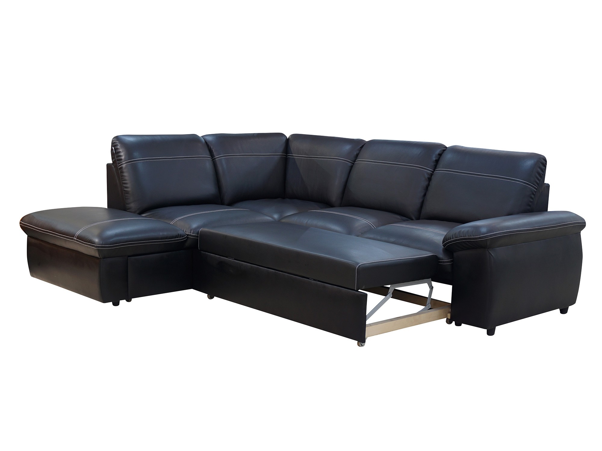 код 86744Комфортабельный раскладной диван в черной кожаной обивке с выдвижным ящиком в основании.