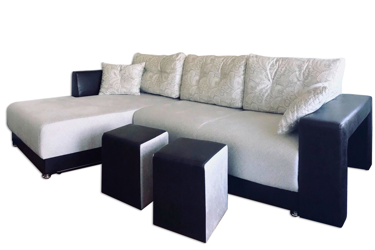 В комплекте 5 подушек и два пуфика. Наличие ящика для белья. Угол левый, под заказ изготавливается и для правостороннего расположения.