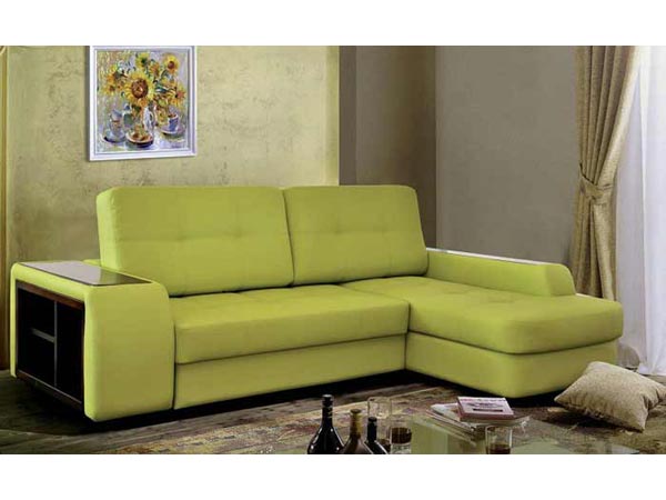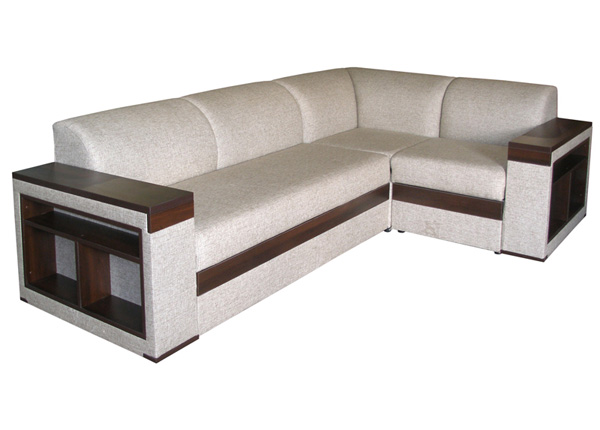 Двухцветный угловой диван с боковыми отсеками для журналов.