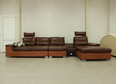 Двухцветный угловой диван с боковыми отсеками для журналов.