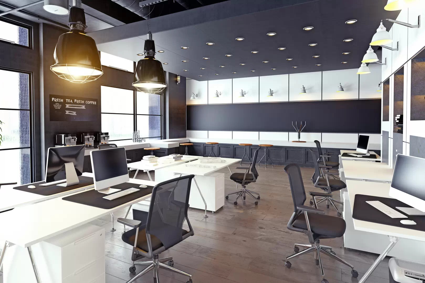 код 113722Интерьер чёрно-белого современного офиса выполнен в стиле лофт.