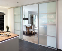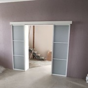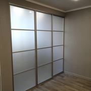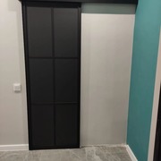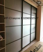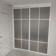 Профиль черного цвета, надежный раздвижной механизм, матовое стекло.