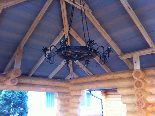Стиль представленной модели кованой люстры является ключевым, такой старинный элемент мебели станет отличным дополнением интерьера загородного дома или ресторана. Основная часть люстры крепится в нескольких местах на длинных цепочках.