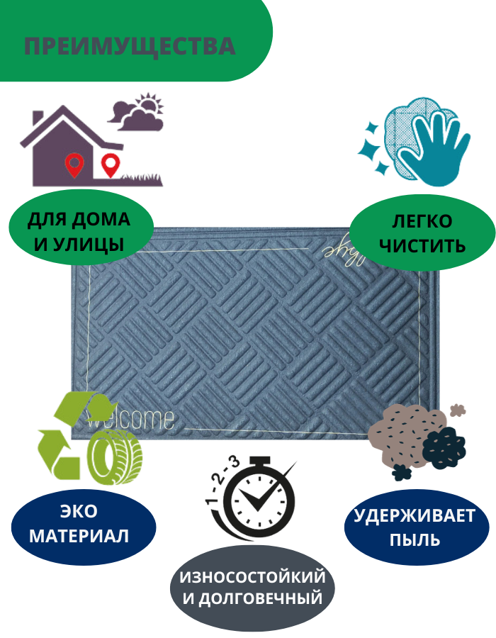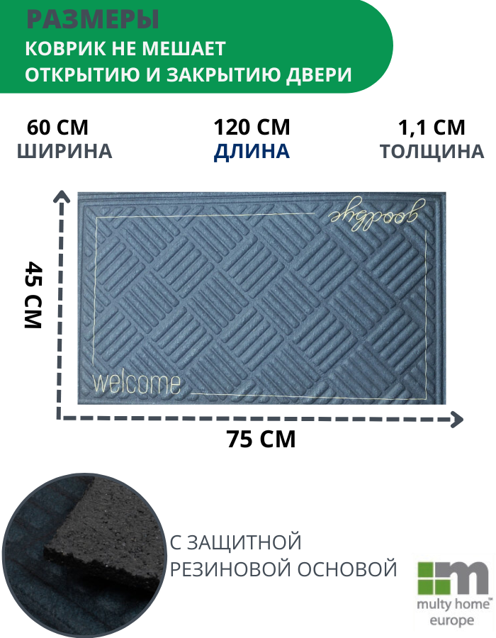 Размер: 45 x 75 см. Такой коврик отлично подойдёт для узких прихожих или небольших входных зон.
