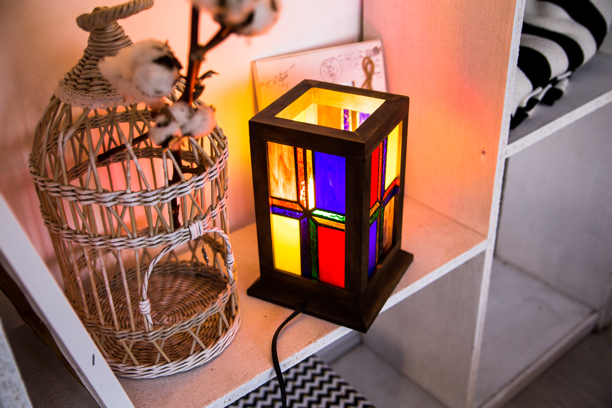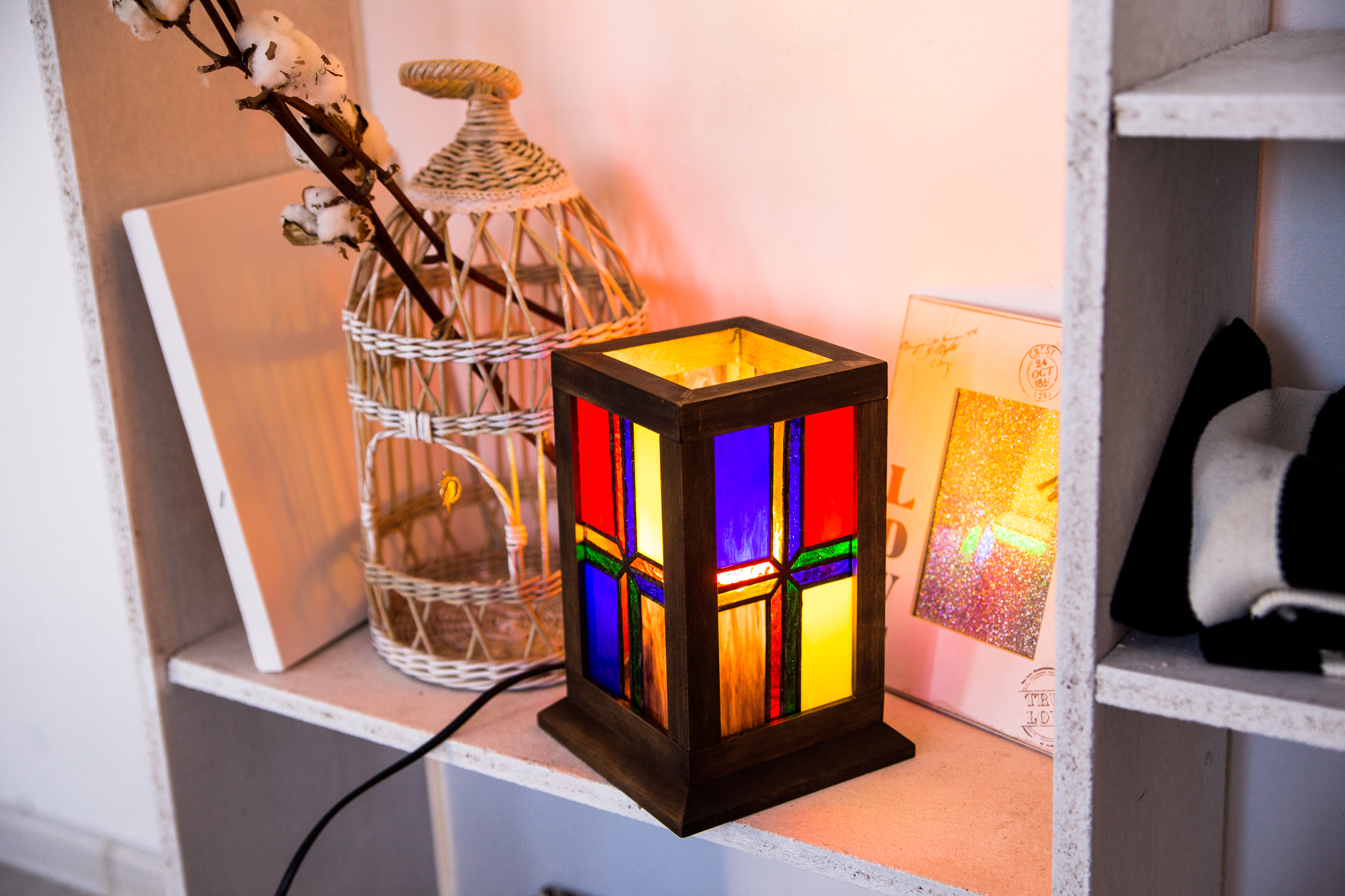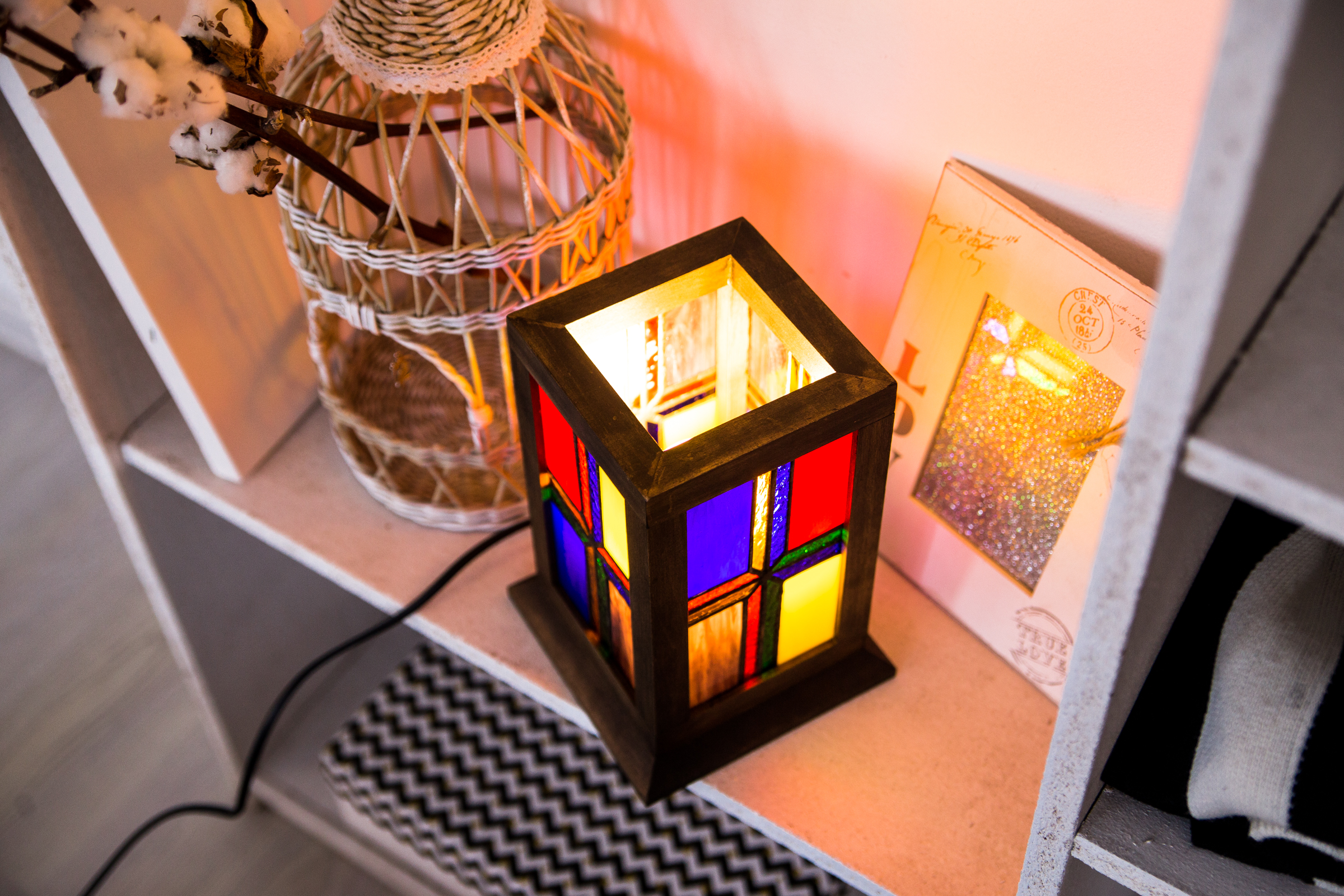 Материал массив ольхи, витражное стекло, металл. Техника «витраж Тиффани»