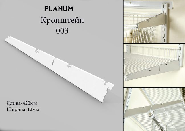 Кронштейн является одним из основных элементов гардеробной системы. Выполнен из стали толщиной 1.0мм. Кронштейн крепится к настенной направляющей. В кронштейн устанавливается подвеска для штанги СтС-007, полка СтС-004 и СтС-025, полка обувная сетчатая СтС-016, полка-корзина СтС-005, рамка держатель СтС-012, полка держатель СтС-022 и выдвижной механизм СтС-030 для выдвижных корзин.