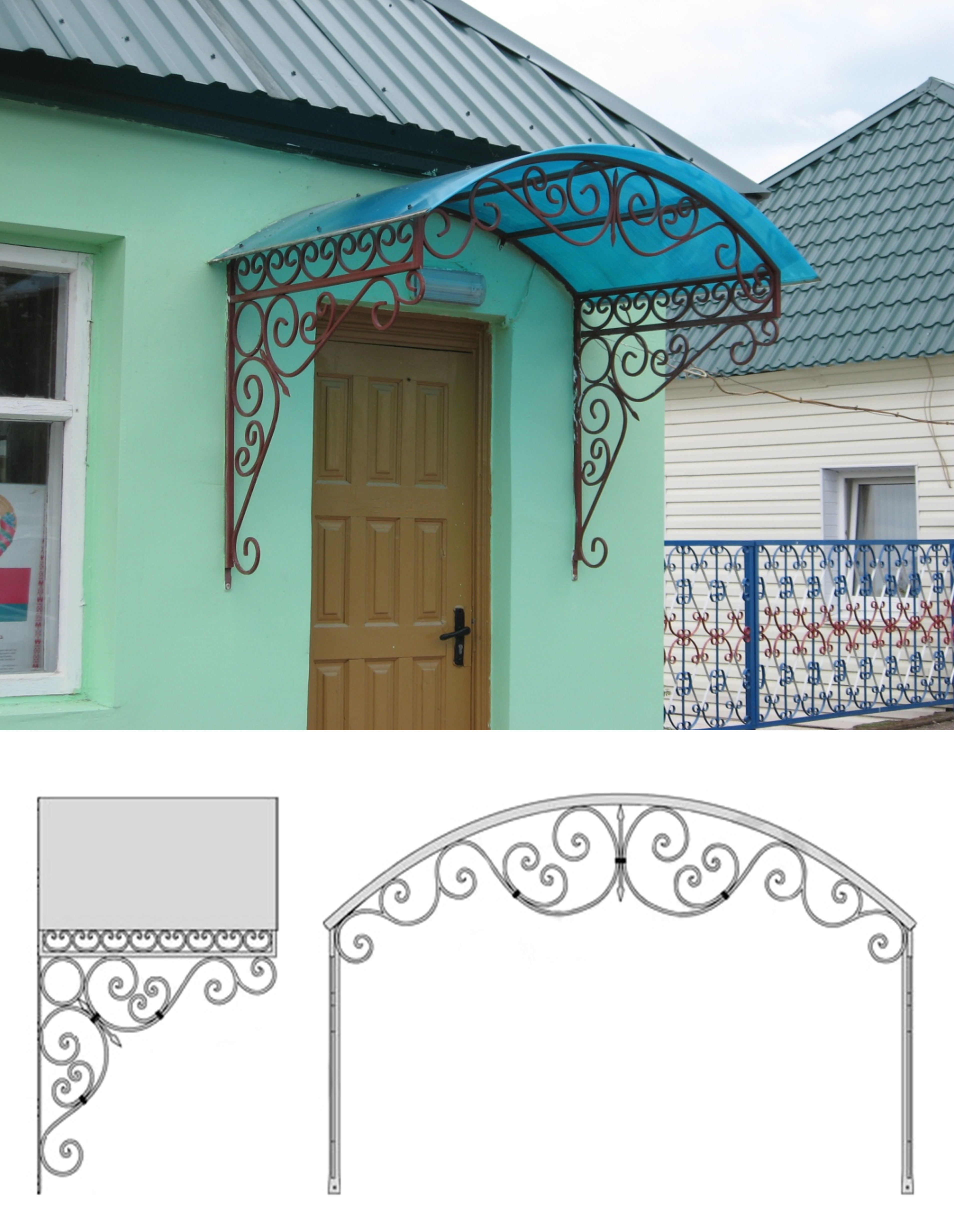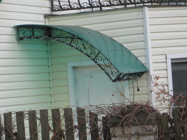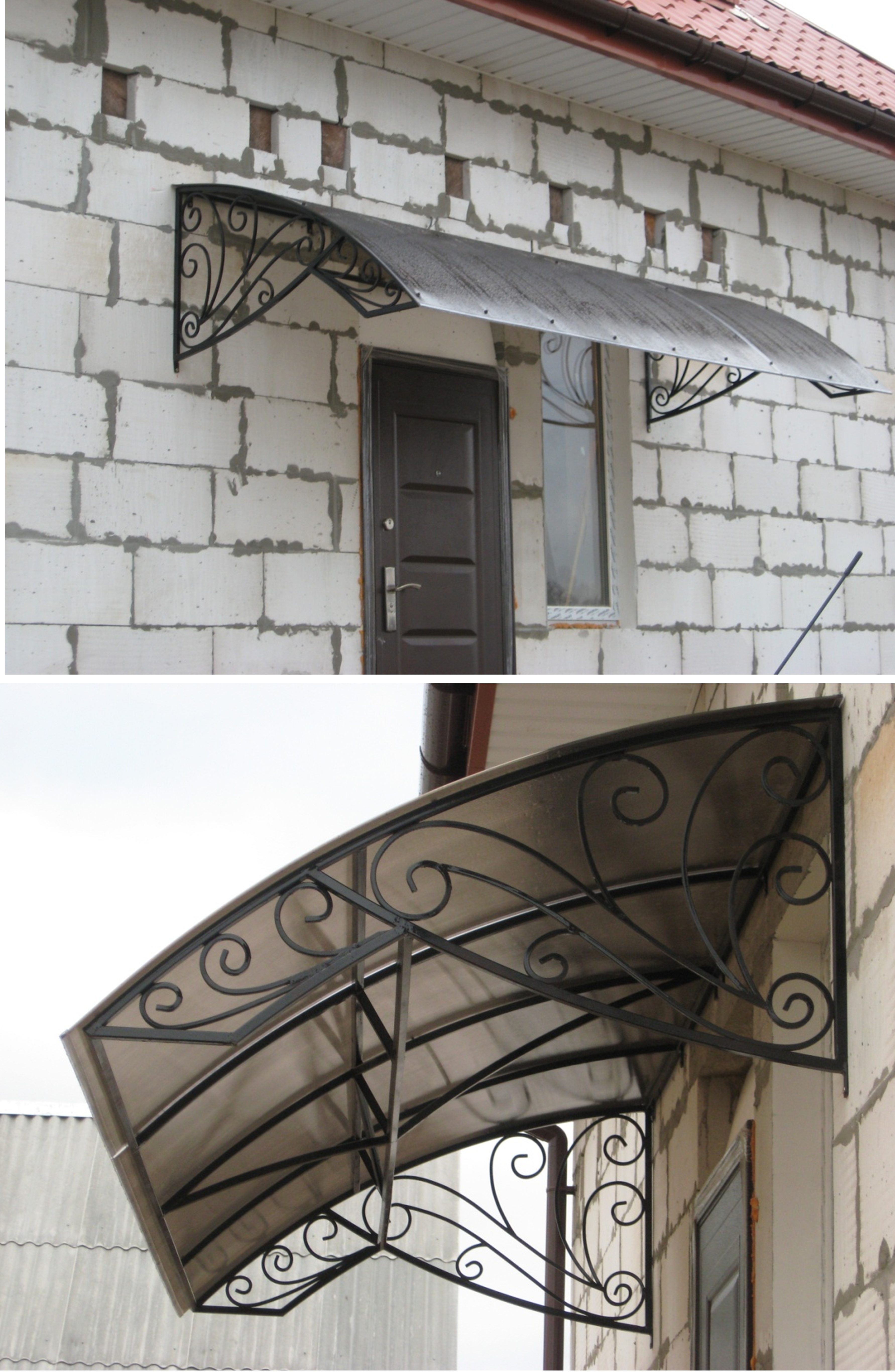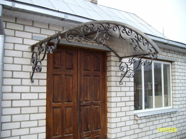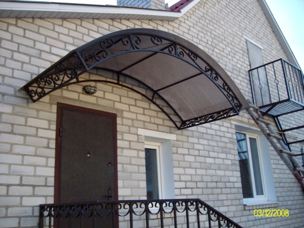 Навесной козырек у входа в дом - это достаточно важная деталь, тк позволяет защищает крыльцо и фундамент около него от излишней влаги, а владельцев и гостей жилища от неприятных сюрпризов непогоды, таких как дождь, снег или гололедицы. Также козырек может служить настоящим украшением дома. Практически идеальный вариант - это сочетание изящной и надежной художественной ковки и полупрозрачного долговечного поликарбоната.