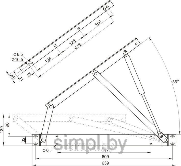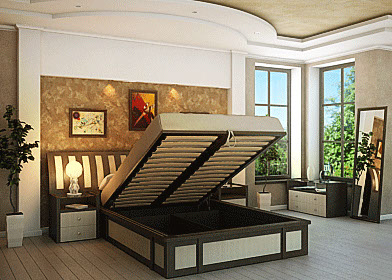 Механизм комплектуется газовыми пружинами усилием 500, 800, 1000 или 1200 ньютонов. Такой механизм позволяет поднять спальное место (кровать, тахта) на угол до 36 градусов. Наличие газовых пружин гарантирует бесшумную, плавную и долговечную работу, повышает потребительские свойства данного изделия.