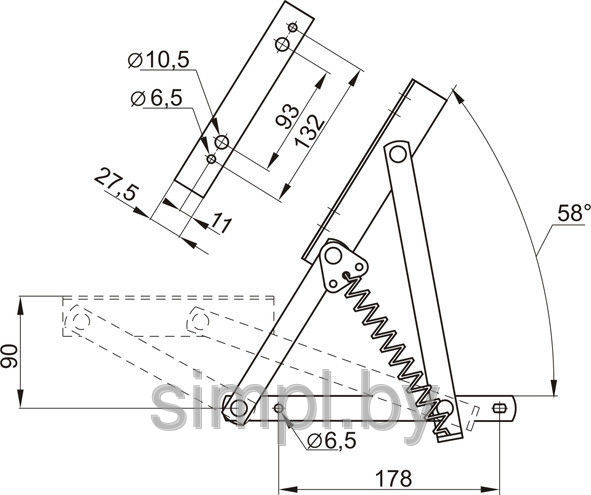 Механизм комплектуется пружиной, усилием 400Н. При изготовлении механизмов применяется высокопрочная сталь с цинковым покрытием. Процесс производства осуществляется на профессиональном современном оборудовании завода. Угол подъема представленной модели равен 58".
