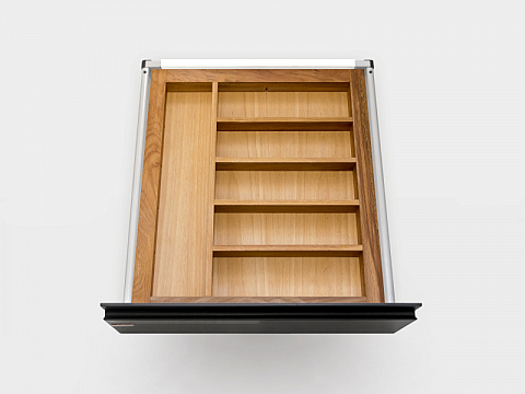 Лоток из бука, вставляемый в выдвижной ящик. Имеет 5 одинаковых ячеек и одну вертикальную удлиненную. Подходит для хранения столовых приборов и мелких кухонных принадлежностей. Собирается по системе шип-паз.