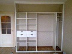 Изготавливается из ЛДСП. Штанги для одежды, выдвижные ящики, открытые ниши.