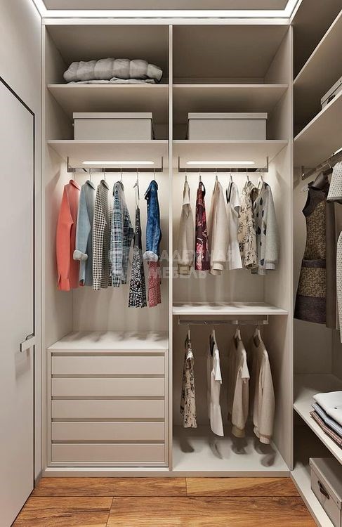 Угловая гардеробная с выдвижными ящиками, полками, штангами.