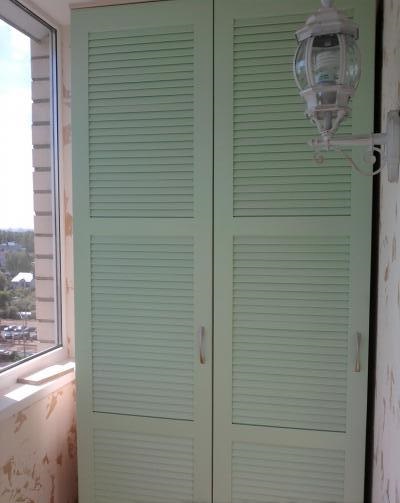 Двустворчатый шкаф на балкон эмалирован в мятный цвет. Дверцы жалюзи с круглыми металлическими ручками. Удобное наполнение в два отдела с полками и выдвижными ящиками.