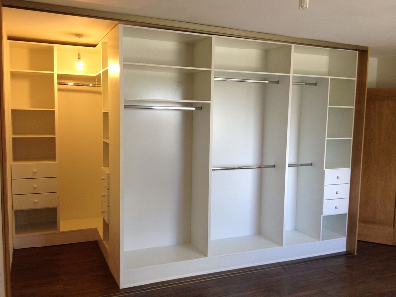 Оснащается стеллажами, штангами, полками для хранения, тумба с выдвижными ящиками.