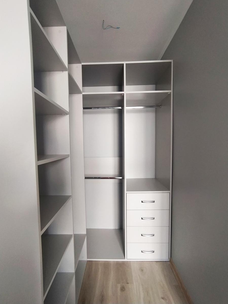 Оснащается стеллажами, штангами, полками для хранения, тумба с выдвижными ящиками.