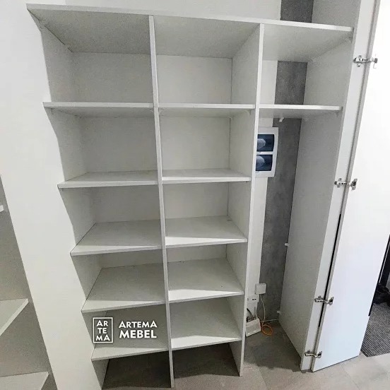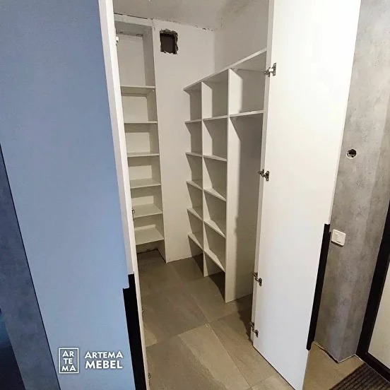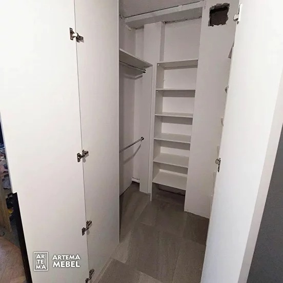 Оснащается шкафом, открытыми нишами, штангами для одежды, ящиками, подсветкой.