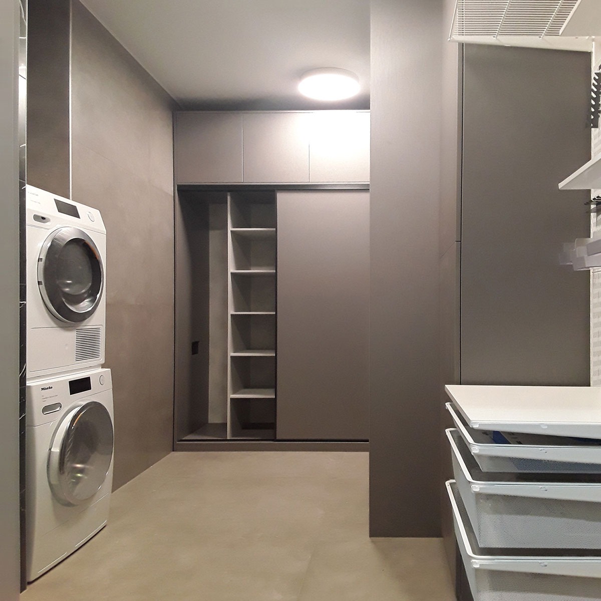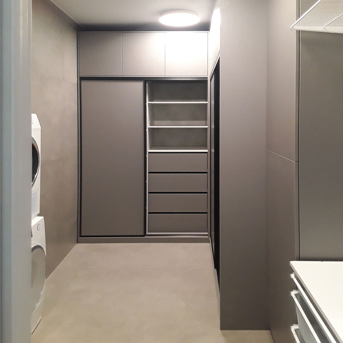 Функциональная гардеробная с ящиками, полками для обуви, штангами и шкафами.