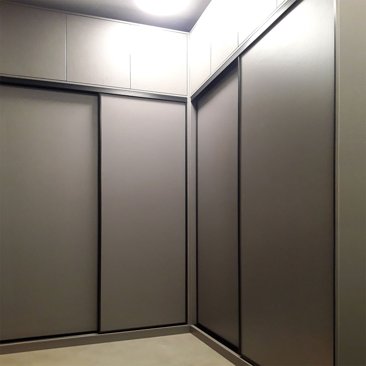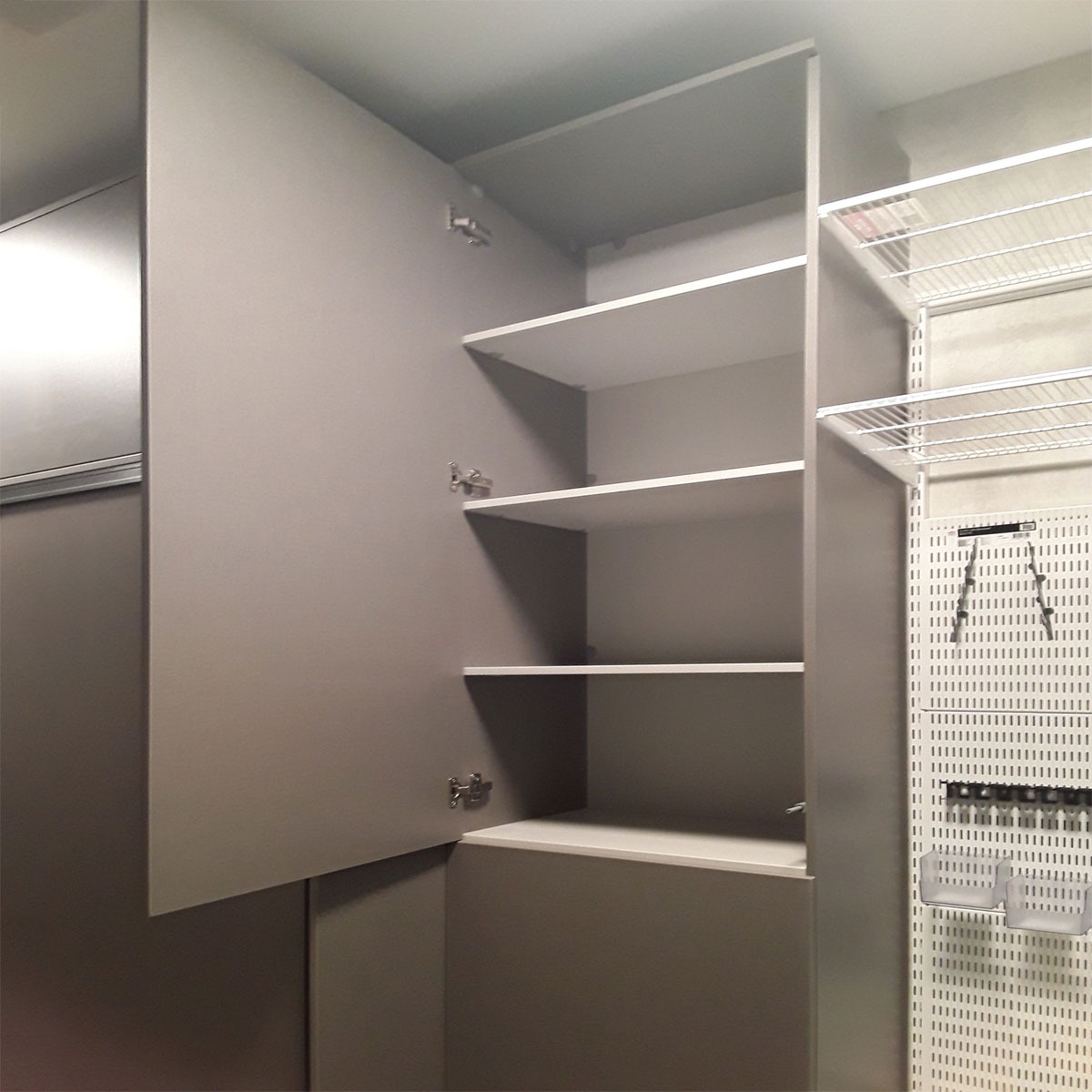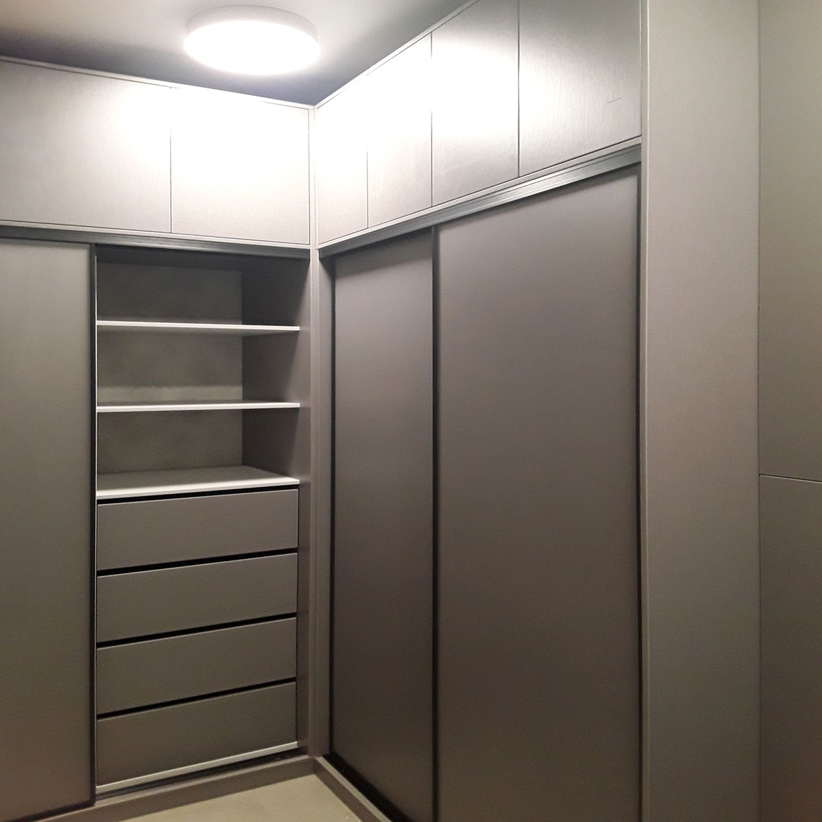 Оснащается штангами для одежды, полками и выдвижными ящиками.