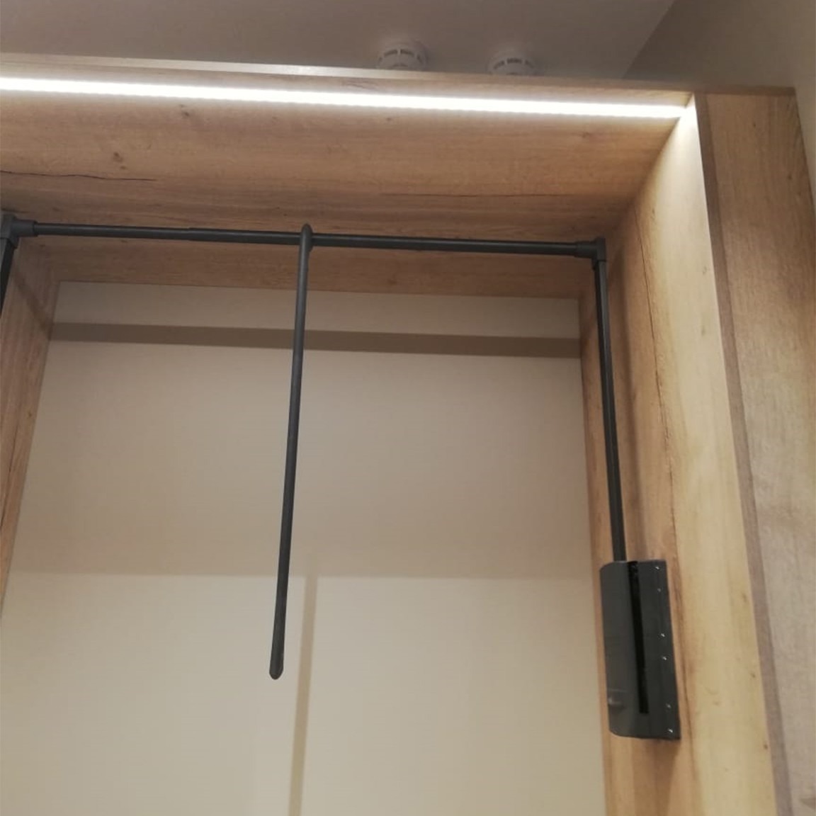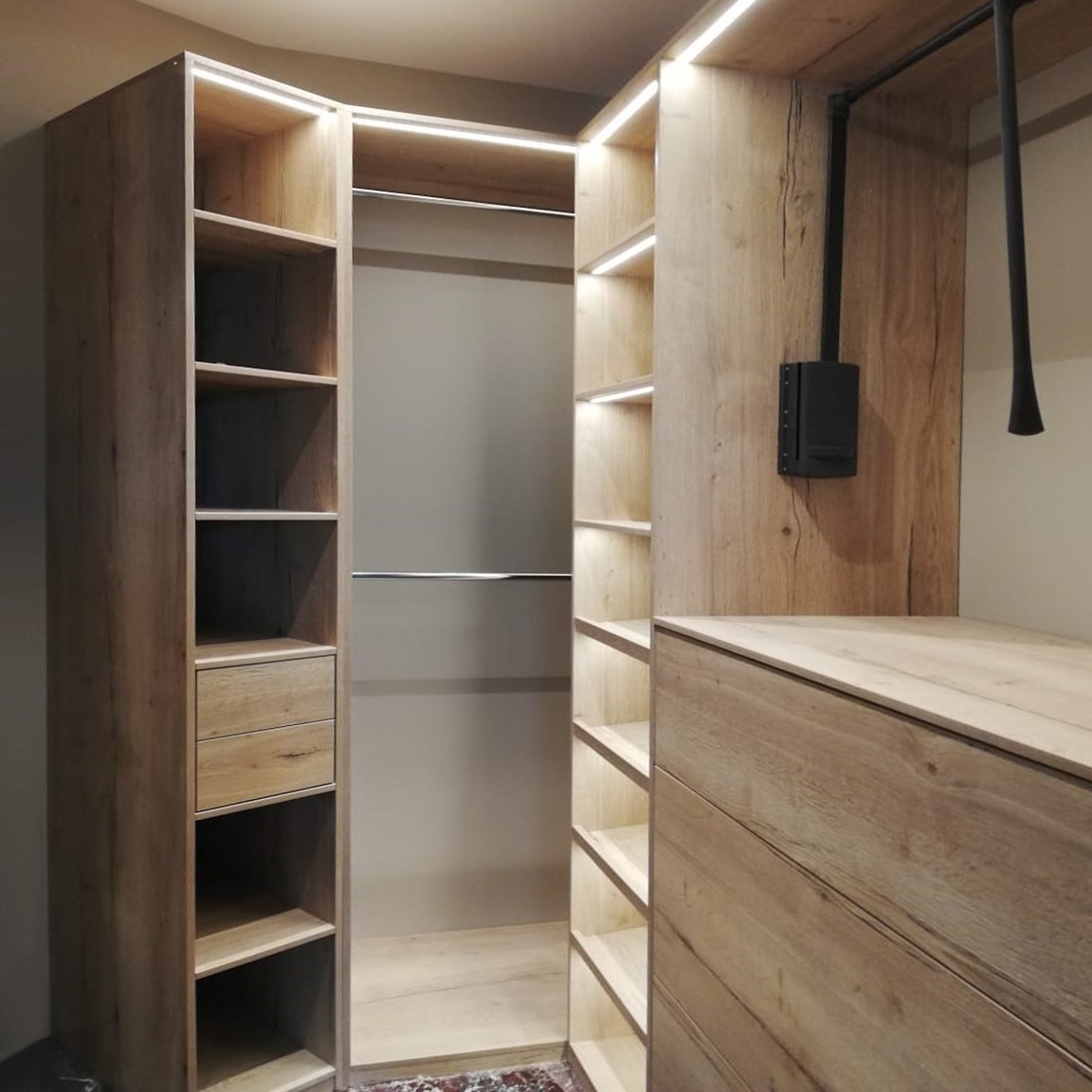 Оснащается штангами для одежды, полками и выдвижными ящиками.