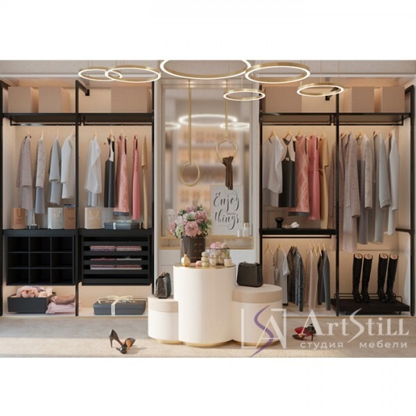 Гардеробная выполнена в «Современном стиле». Гардеробная на заказ позволяет выбрать стиль и цвет, а также расположение и размер ниш под хранение. Открытая настенная система хранения позволяет получить быстрый доступ к вещам и не занимает много места.