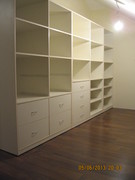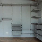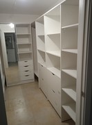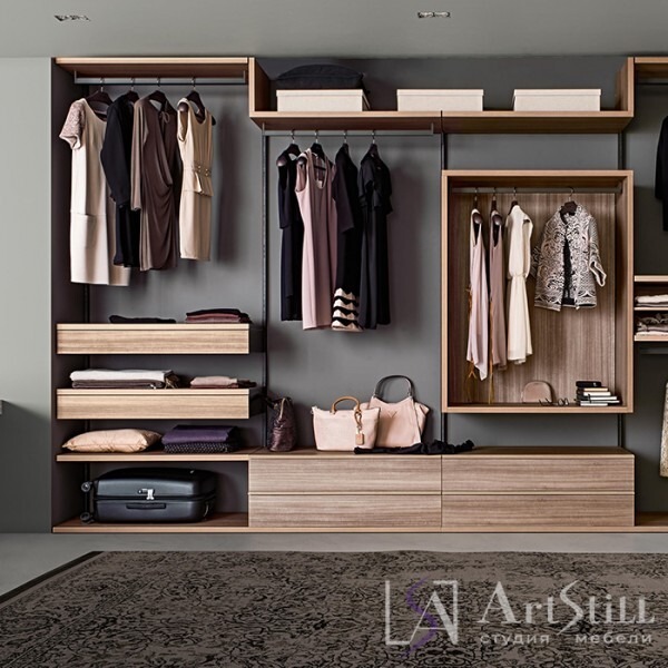 Гардеробная выполнена в «Современном стиле». Гардеробная на заказ позволяет выбрать стиль и цвет, а также расположение и размер ниш под хранение. Открытая настенная система хранения позволяет получить быстрый доступ к вещам.