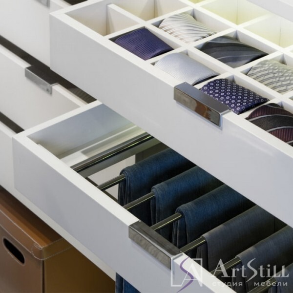 Штанги для одежды, выдвижные ящики открытые полки.