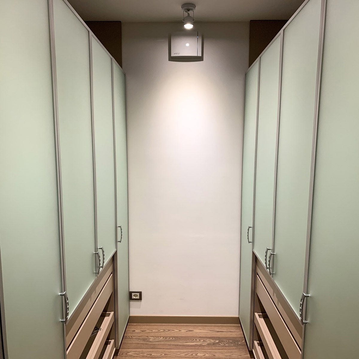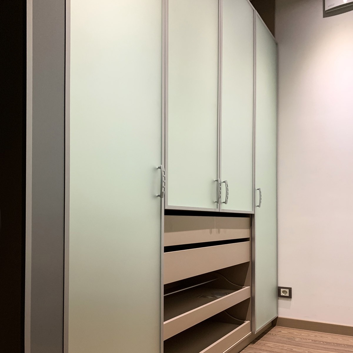 Двери: распашные фасады в алюминиевом профиле, наполнение зеркало матовое серебро.
