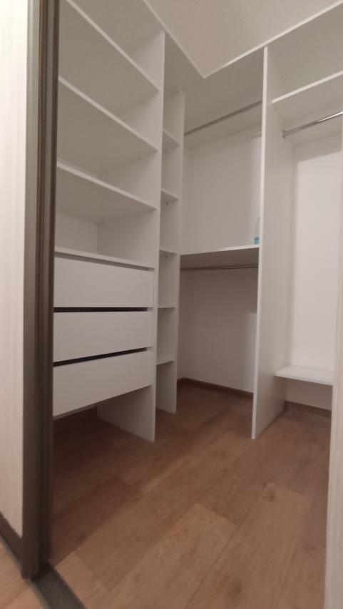 Изготавливается из ЛДСП. Штанги для одежды, выдвижные ящики, открытые ниши. Подсветка.