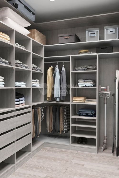 Открытая система со стеллажами, ящиками и штангами для верхней одежды.