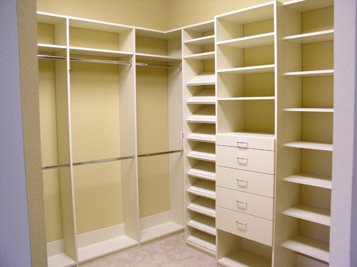 Просторная гардеробная оснащена множеством полок, металлических штанг для вешалок и выдвижных ящиков, которые позволят хранить ваши вещи в уюте и комфорте. Гардеробная представлена в виде угловой конструкции и окрашена в нежный светлый тон.