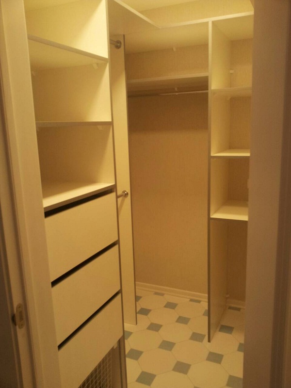 Угловая гардеробная оборудована большим количеством полок. Она представляет собой надежную и долговечную конструкцию. Цвет оформления: белый. Могут применяться раздвижные двери.