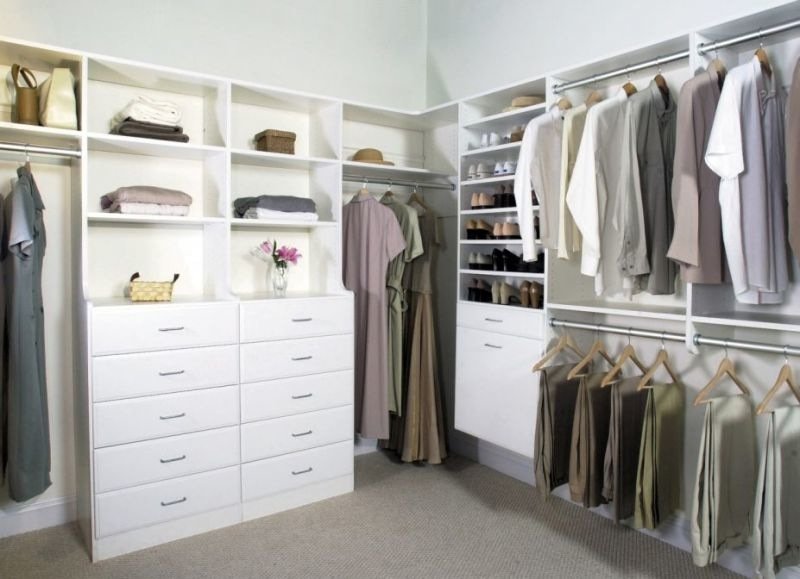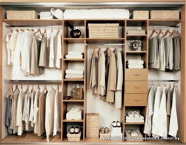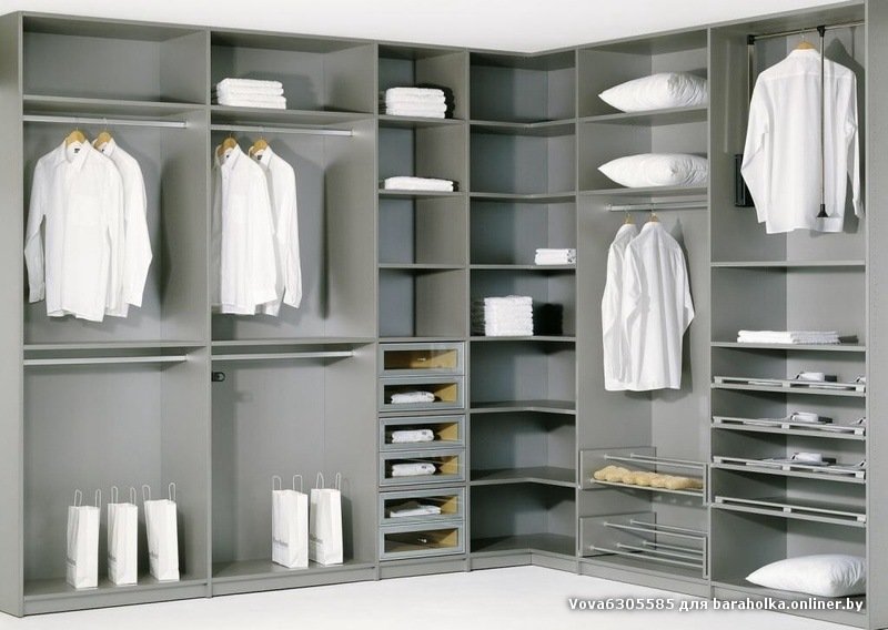 Оснащается штангами для одежды, полками и выдвижными ящиками.