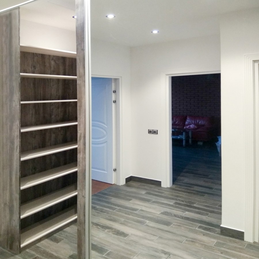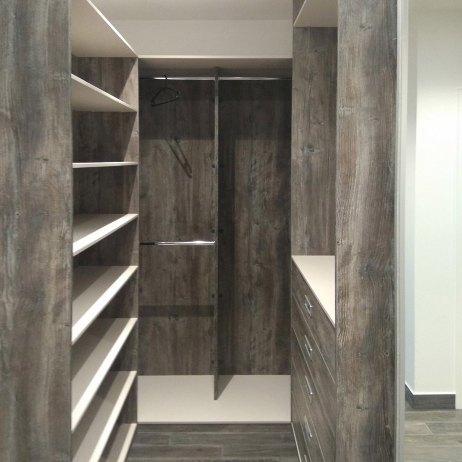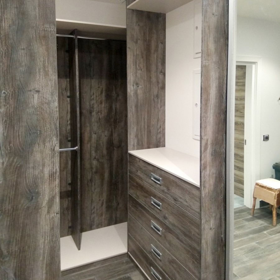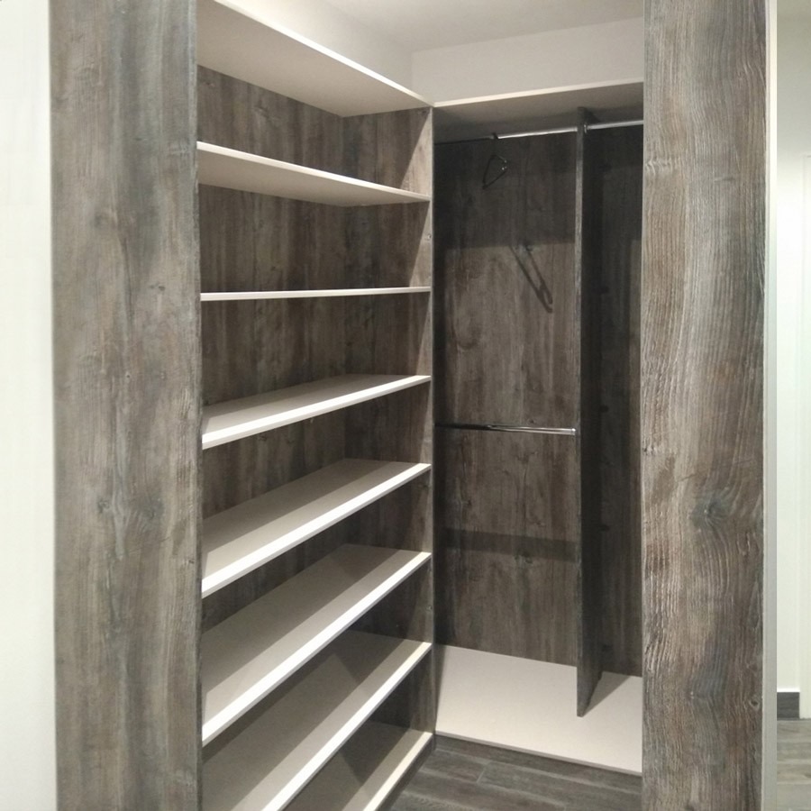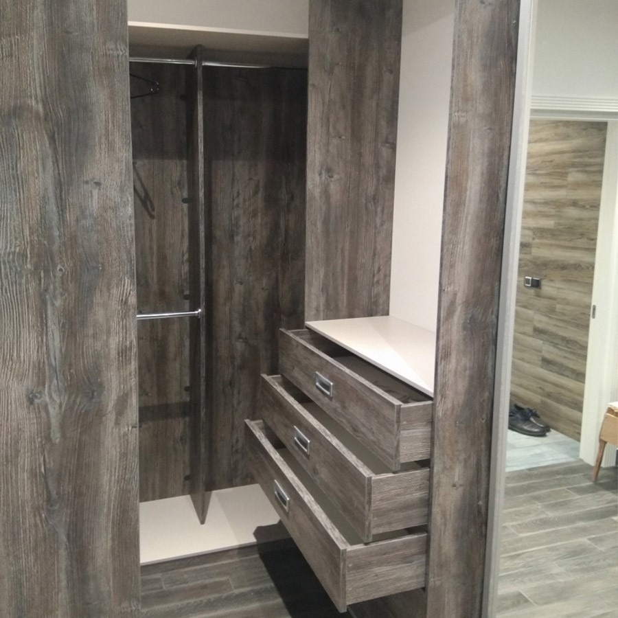Изготавливается из ЛДСП. Штанги для одежды, выдвижные ящики, открытые ниши. Подсветка.