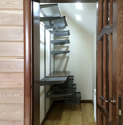 • Полки и декоративные планки из массива берёзы в цвете Венге, они отлично сочетаются с металлическими элементами серого цвета. Гардеробная смотрится стильно и дорого.