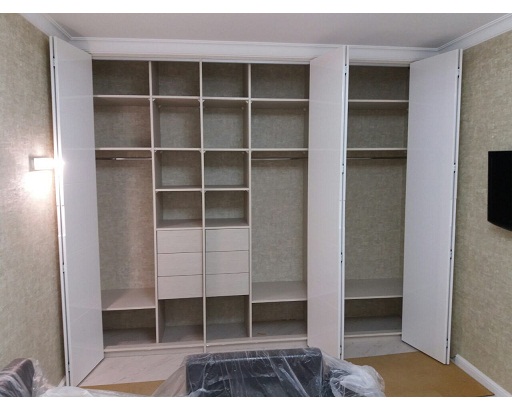 Вместительный шкаф-купе с нестандартной формой створок, которые прикреплены друг к другу. поэтому две створки образуют одну удобную. Шкаф отличается множеством разноразмерных полок и ящиков. Модель белого цвета без традиционных ручек.