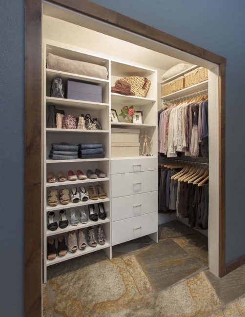 Оснащается штангами для одежды, полками и выдвижными ящиками.