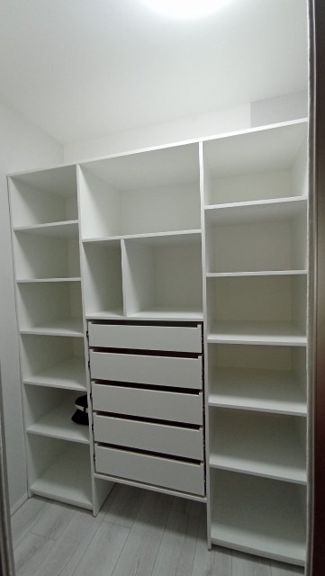 Оснащается штангами для одежды, полками и выдвижными ящиками.